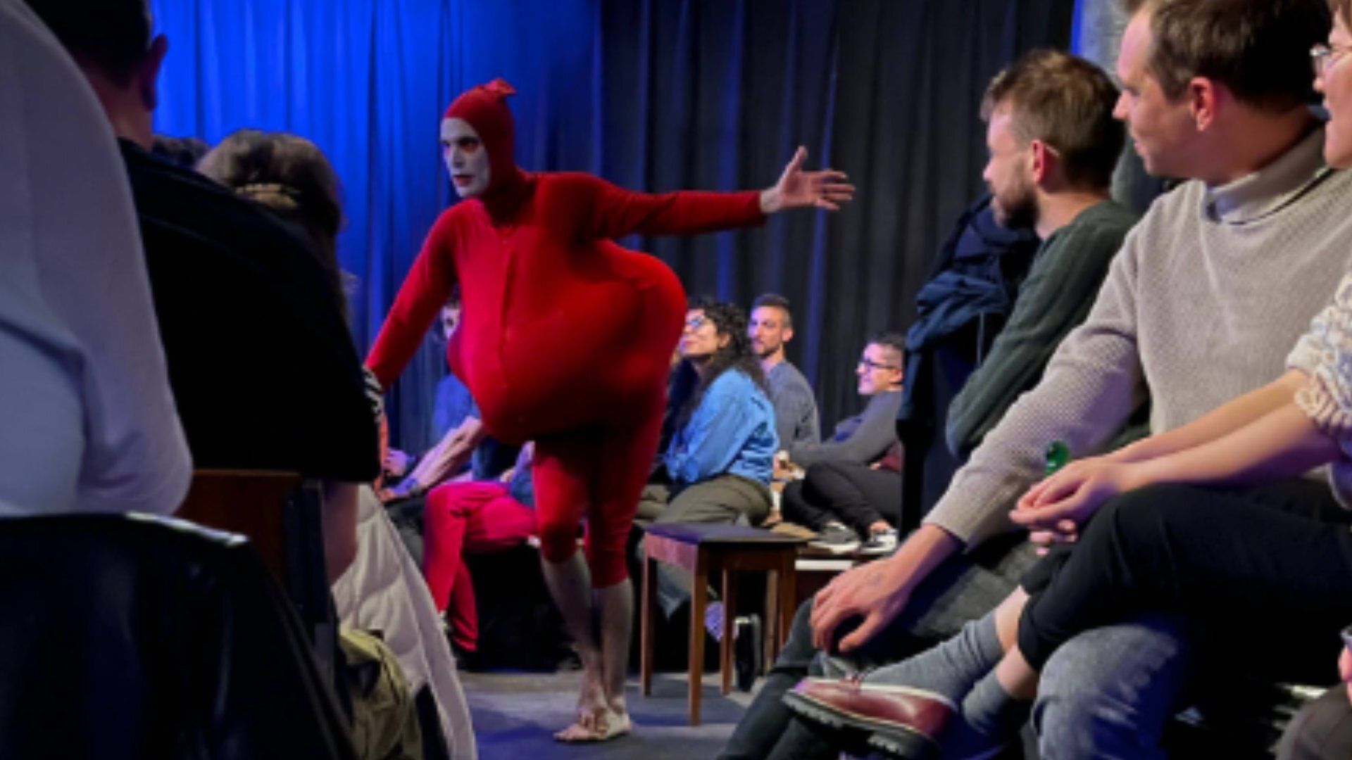 My first time watching a Bouffon show. Fascinating to see how a person is able to hold a room with 200 people for 90 minutes while walking around dressed like a red something, and among other things challenging people about their dreams and threatening to touch them with a licked finger. The fact that the same day I had a 6-hour Bouffon workshop with him made it extra-interesting as I could directly see on stage what we explored during the day, like the urge of the Bouffon to seek his own pleasure.